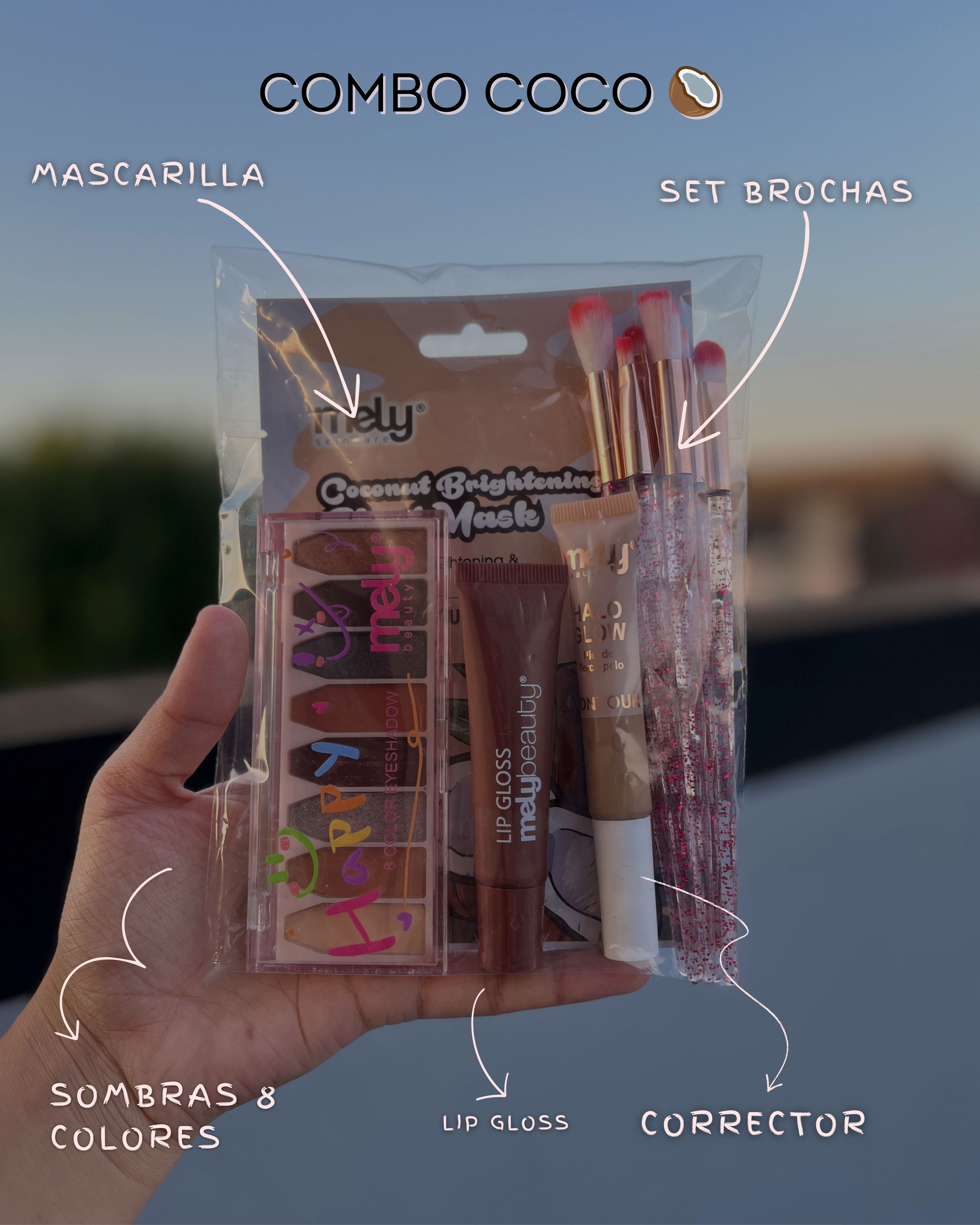 Incluye: Mascarilla facial, Paleta de sombras, Lip gloss, Corrector, Set de brochas.