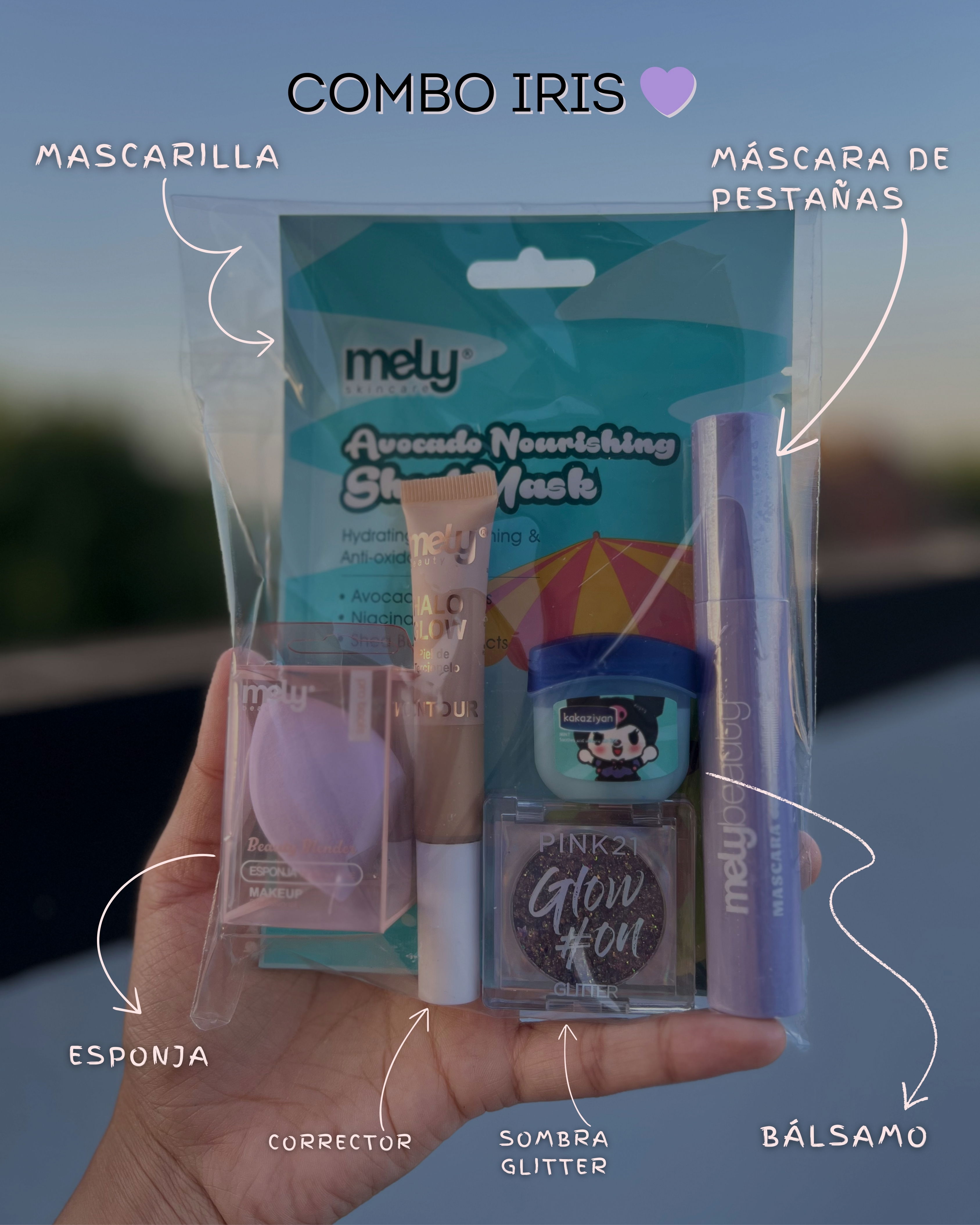 Incluye: Mascarilla, Mascara de pestañas, Esponja, Corrector, Sombra glitter, Balsamo